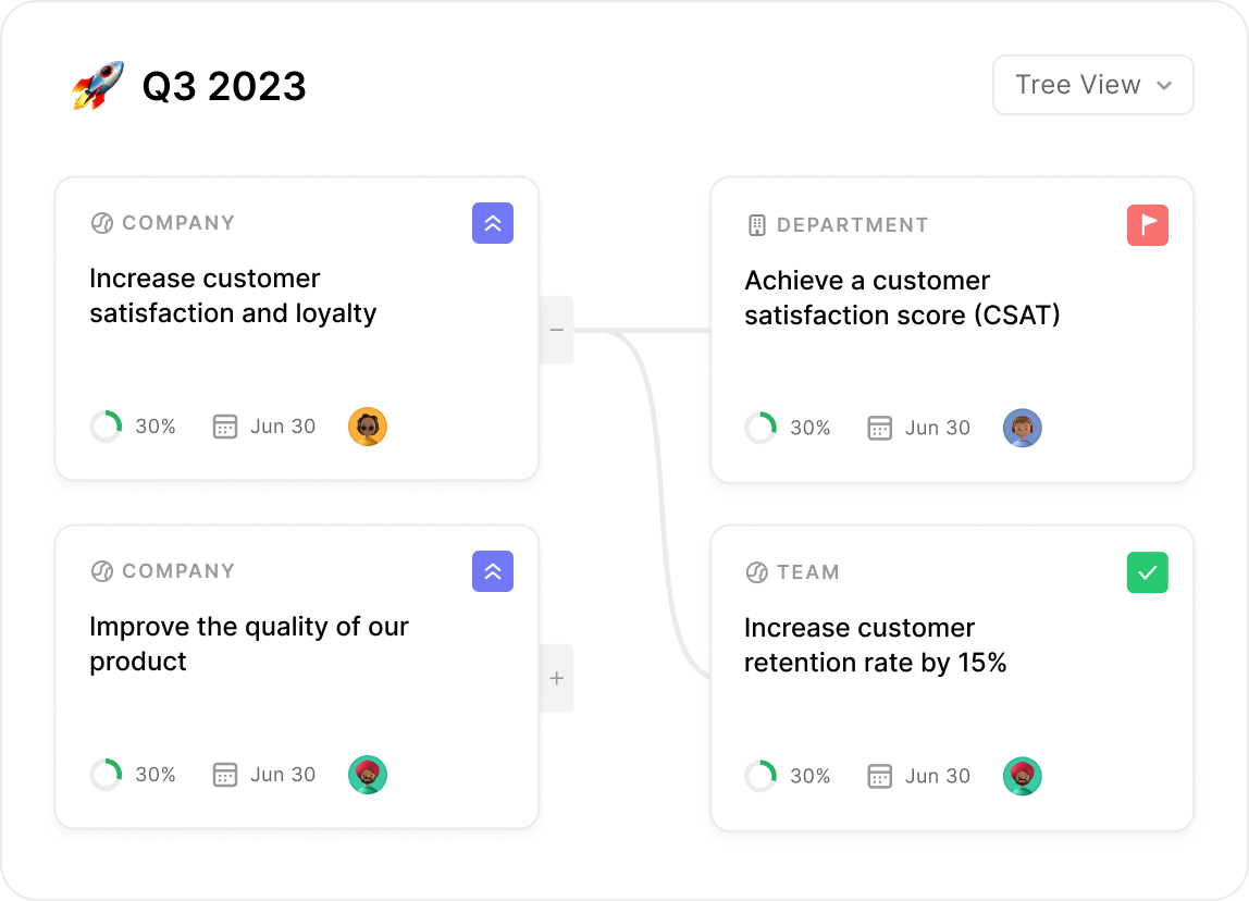 Gain a concise overview of your OKRs through a tree view. Quickly spot connections, track progress, and ensure your OKRs are on the right path.