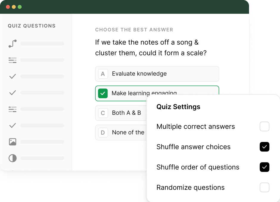 Yes. Lyearn's quiz builder supports multiple question types including multiple choice, true/false, matching, fill-in-the-blank, and essay questions. You can set passing scores, allow retakes, randomize questions, provide feedback, and track assessment performance.