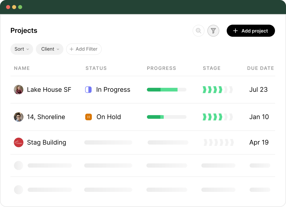 Access a complete view of every project including stages, ownership, status, and connected tasks so nothing slips through the cracks.