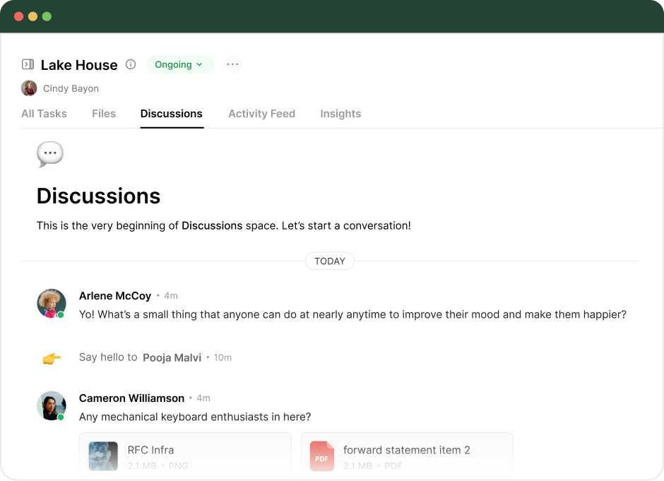 Keep all project conversations in one place so decisions, updates, and collaboration stay contextual and actionable.