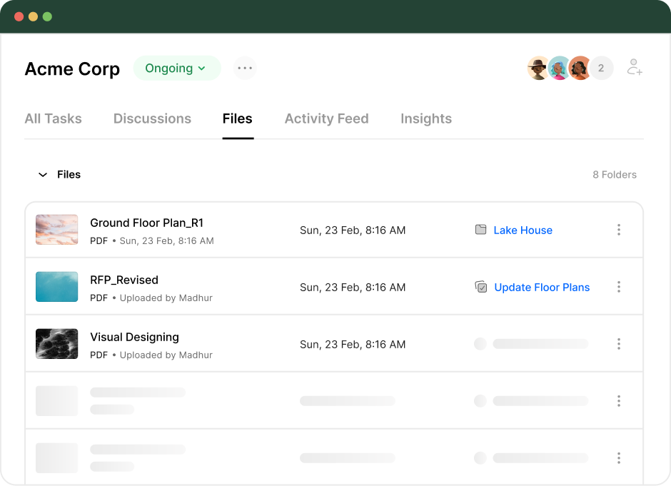Store and access all project related documents within the workspace to eliminate scattered communication and lost information.